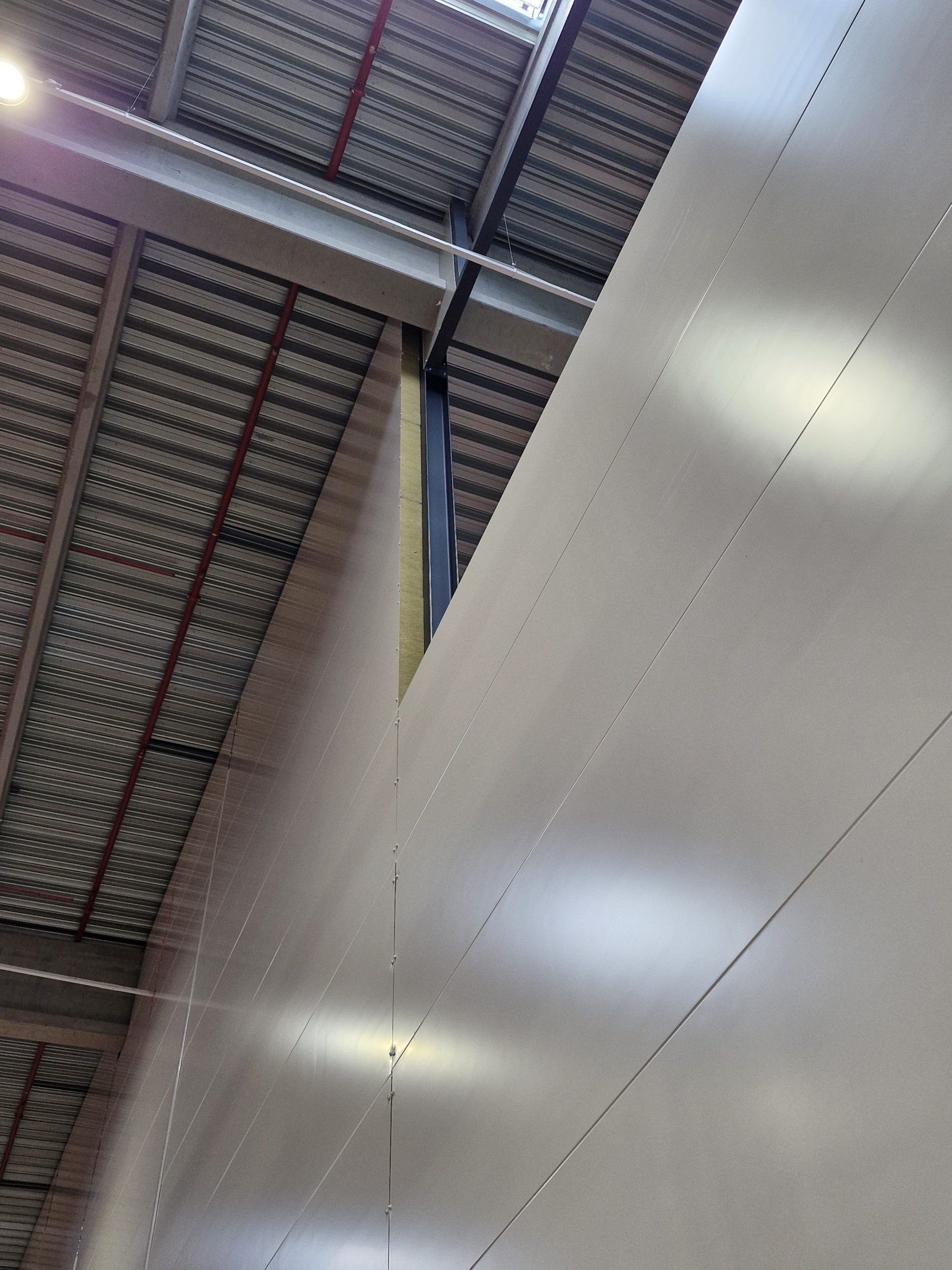 Réalisation d'une cloison en panneaux laine de roche d'épaisseur 170mm fixés horizontalement sur une charpente métallique spécialement étudiée.